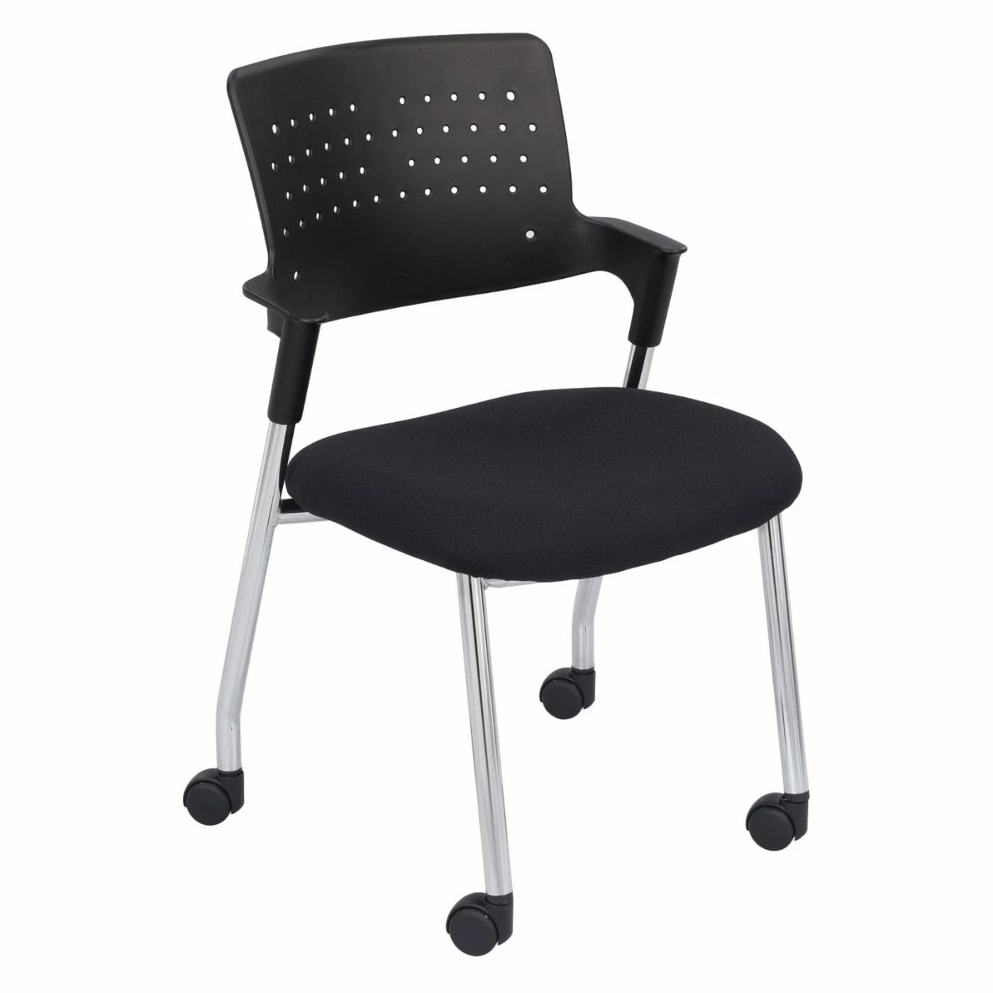 Extra seating doesnβt have to be boring and with the Safco Spry Guest Chair β Black, you can provide your workspace with a touch of modern excitement. This chair features a comfortable contoured seat and ventilated back. Black and chrome give it a sleek, modern look. Smooth rolling casters keep it moving wherever you need it.