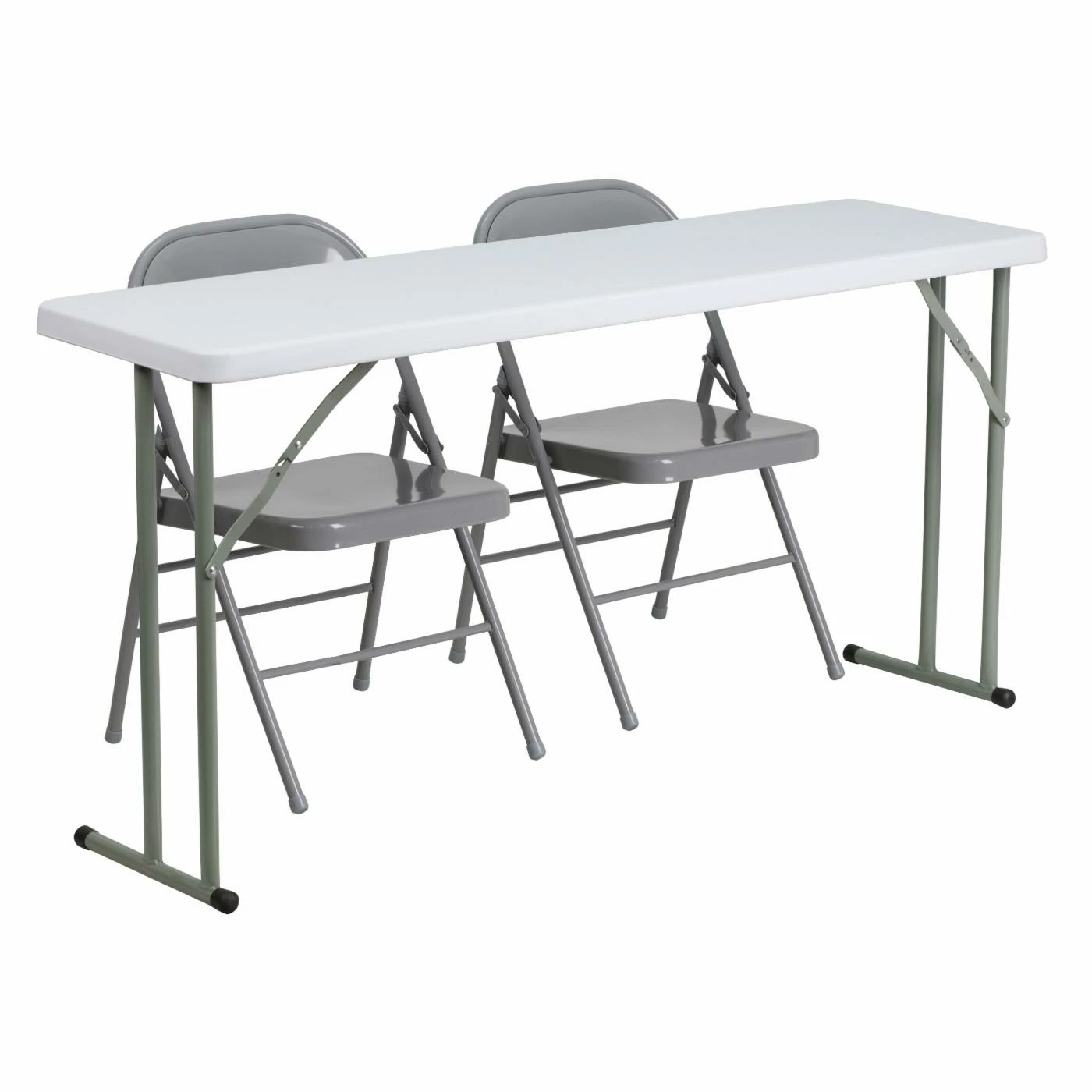 Useful and well-built, this Flash Furniture RB-1860-1 18 x 60 in. Rectangle Folding Training Table with 2 Gray Metal Folding Chairs boasts sturdy metal and plastic construction. The set includes a folding table and two gray metal folding chairs. All pieces are easy to store and conveniently stain-resistant.
