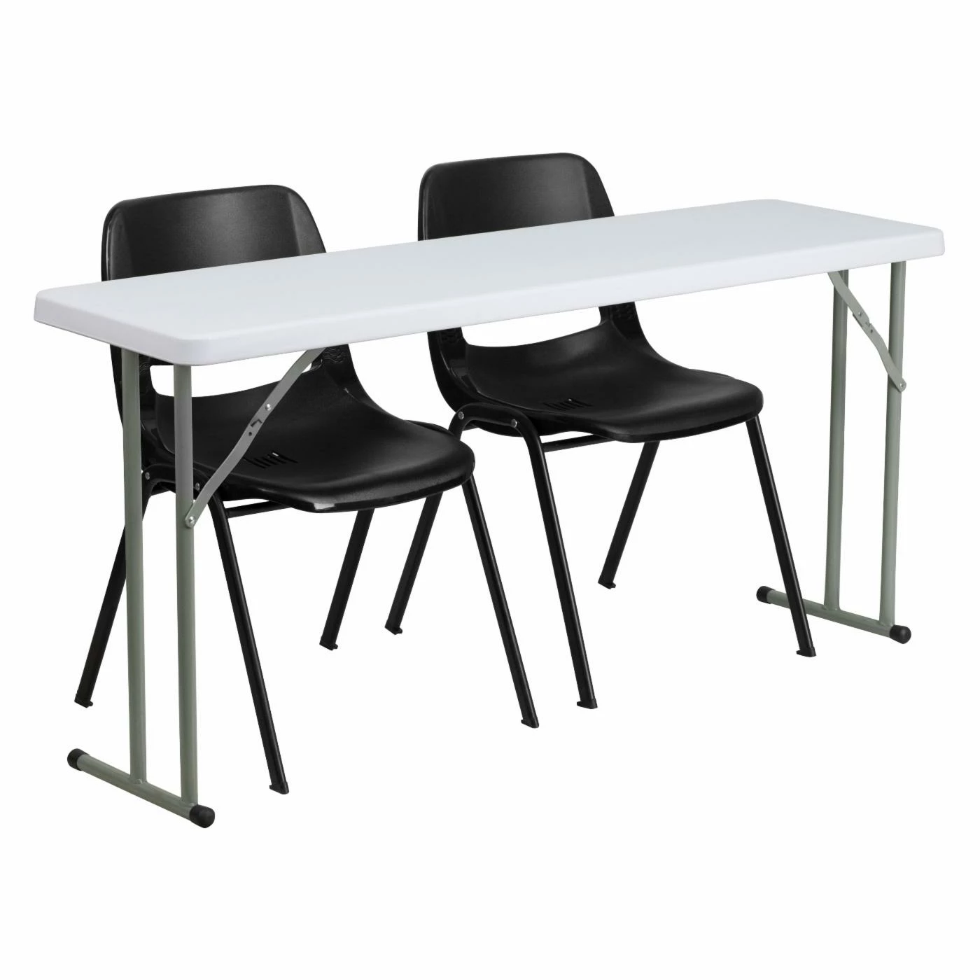 Made of strong metal and plastic materials, this Flash Furniture RB-1860-2 18 x 60 in. Rectangle Folding Training Table with 2 Black Plastic Folding Chairs is perfect for a card game, game night, or whenever you want extra seating and table space. Metal and plastic construction ensures lasting durability, and it’s also easy to store when not in use. The two folding chairs add comfortable extra seating in a flash.