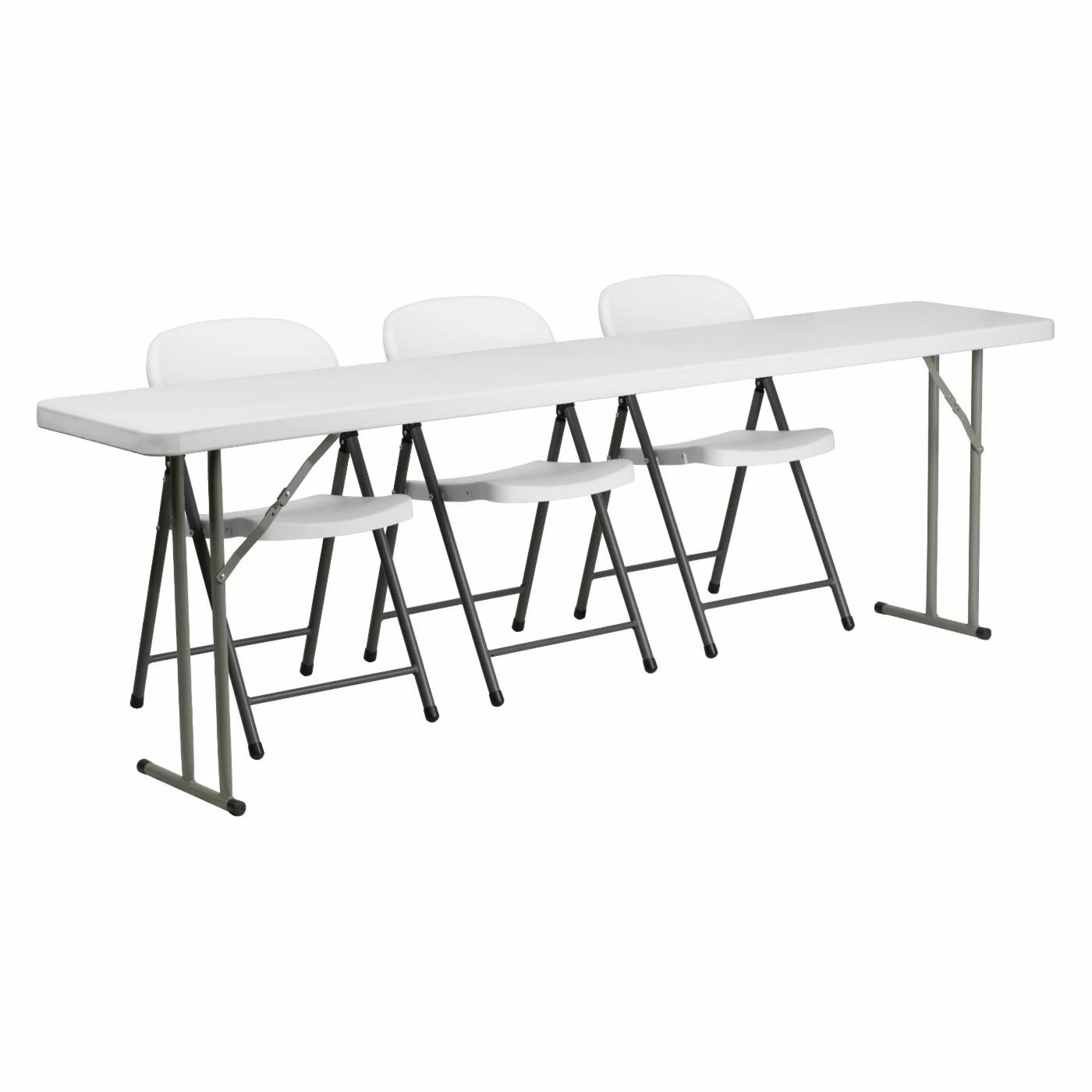 The impressively durable Flash Furniture RB-1896-2 18 x 96 in. Rectangle Folding Training Table with 3 White Plastic Folding Chairs boasts metal and plastic construction. The set includes a folding table and three white plastic folding chairs. Pieces are easy to clean, stain-resistant, and are just as easy to put away when you’re done using them.