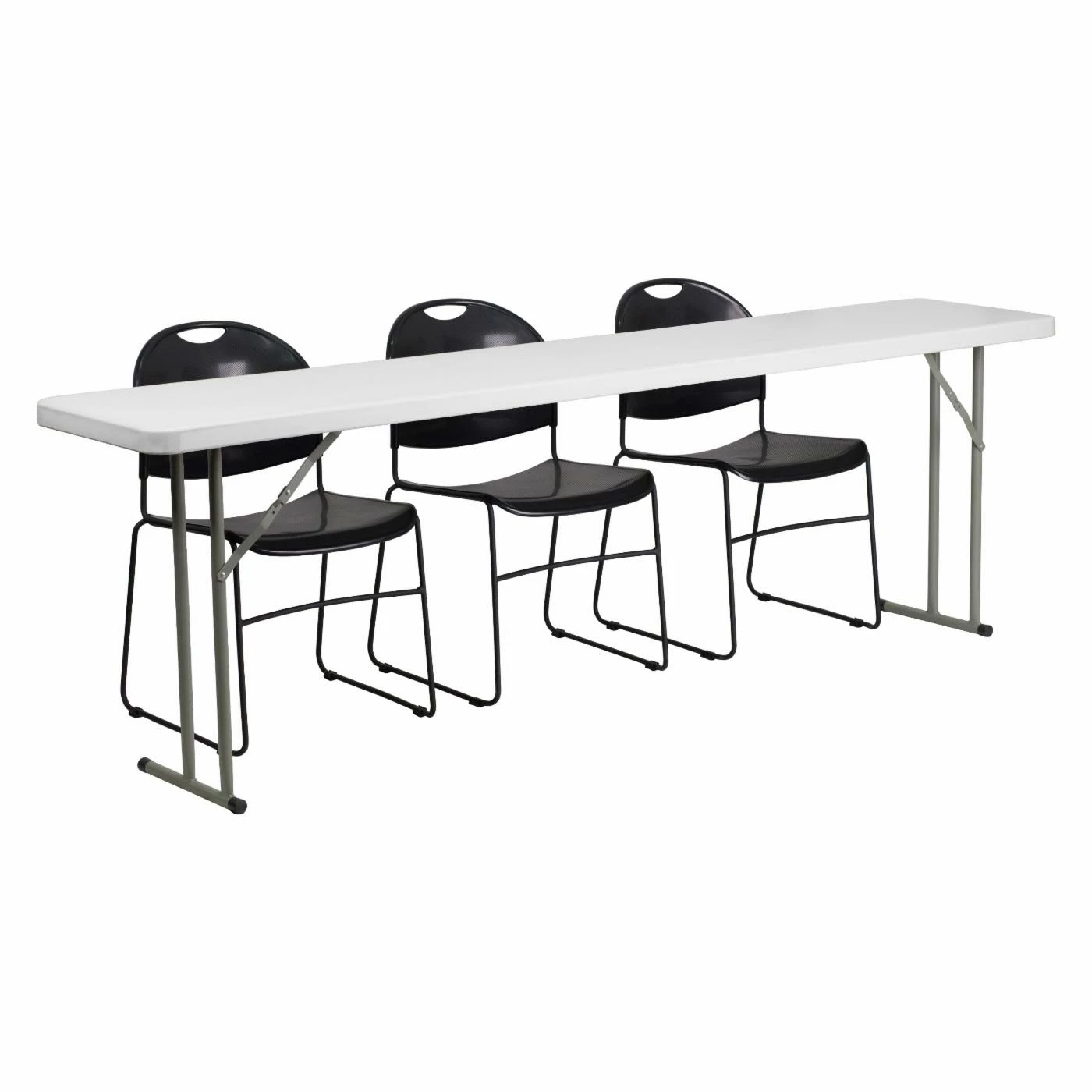 The metal and plastic construction of this Flash Furniture RB-1896-1 18 x 96 in. Rectangle Folding Training Table with 3 Black Plastic Stack Chairs guarantees long-term, durable use. This set includes a folding table and three stacking plastic chairs. Pieces are stain-resistant and easy to transport or store.