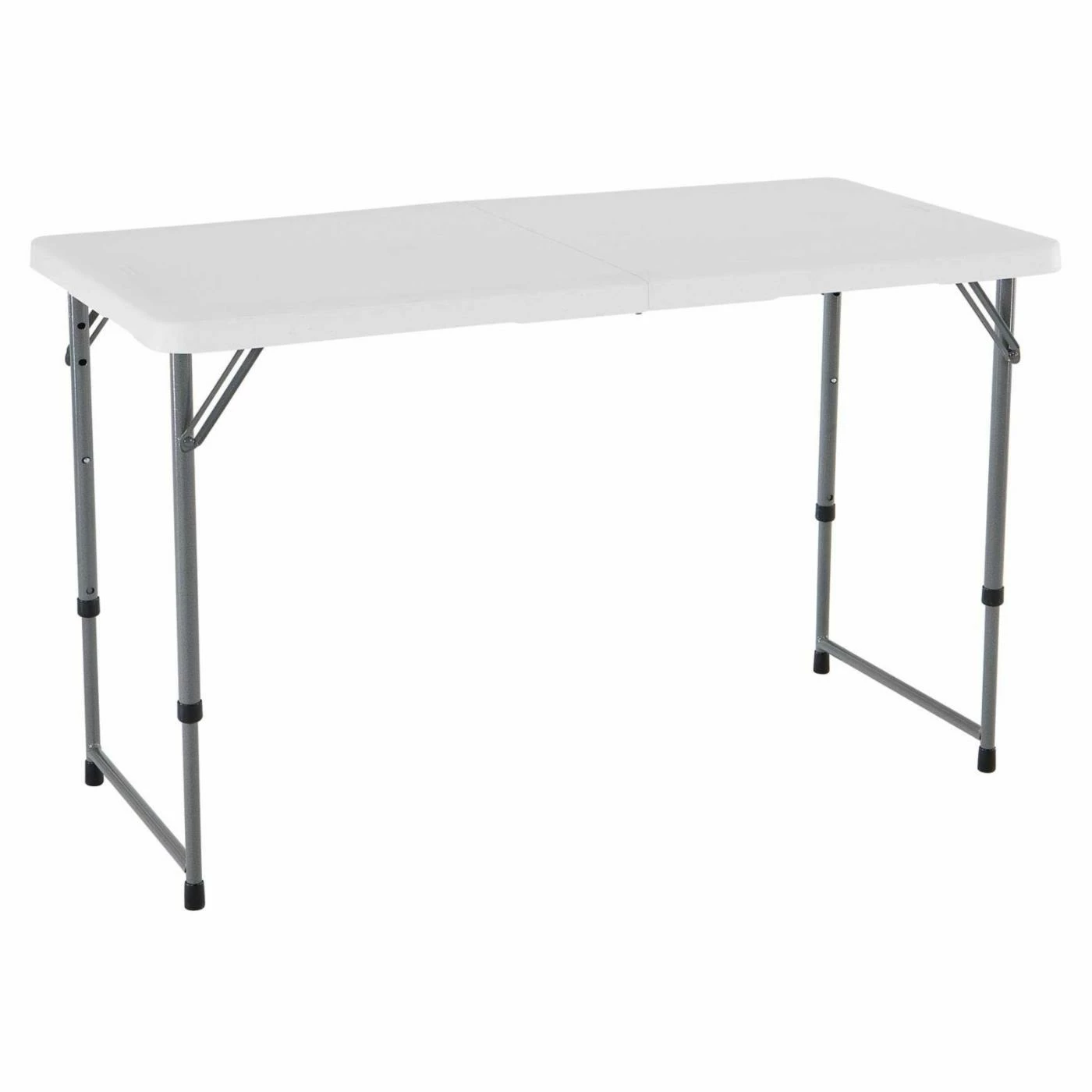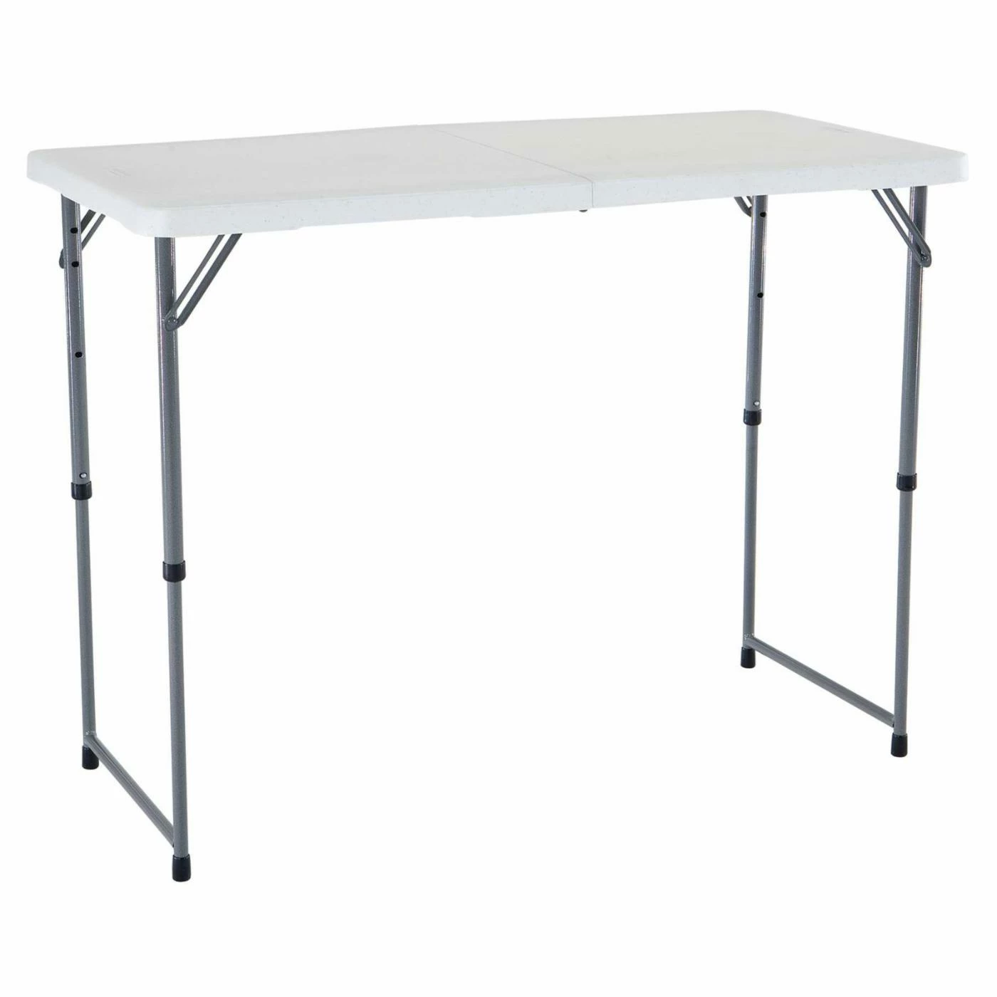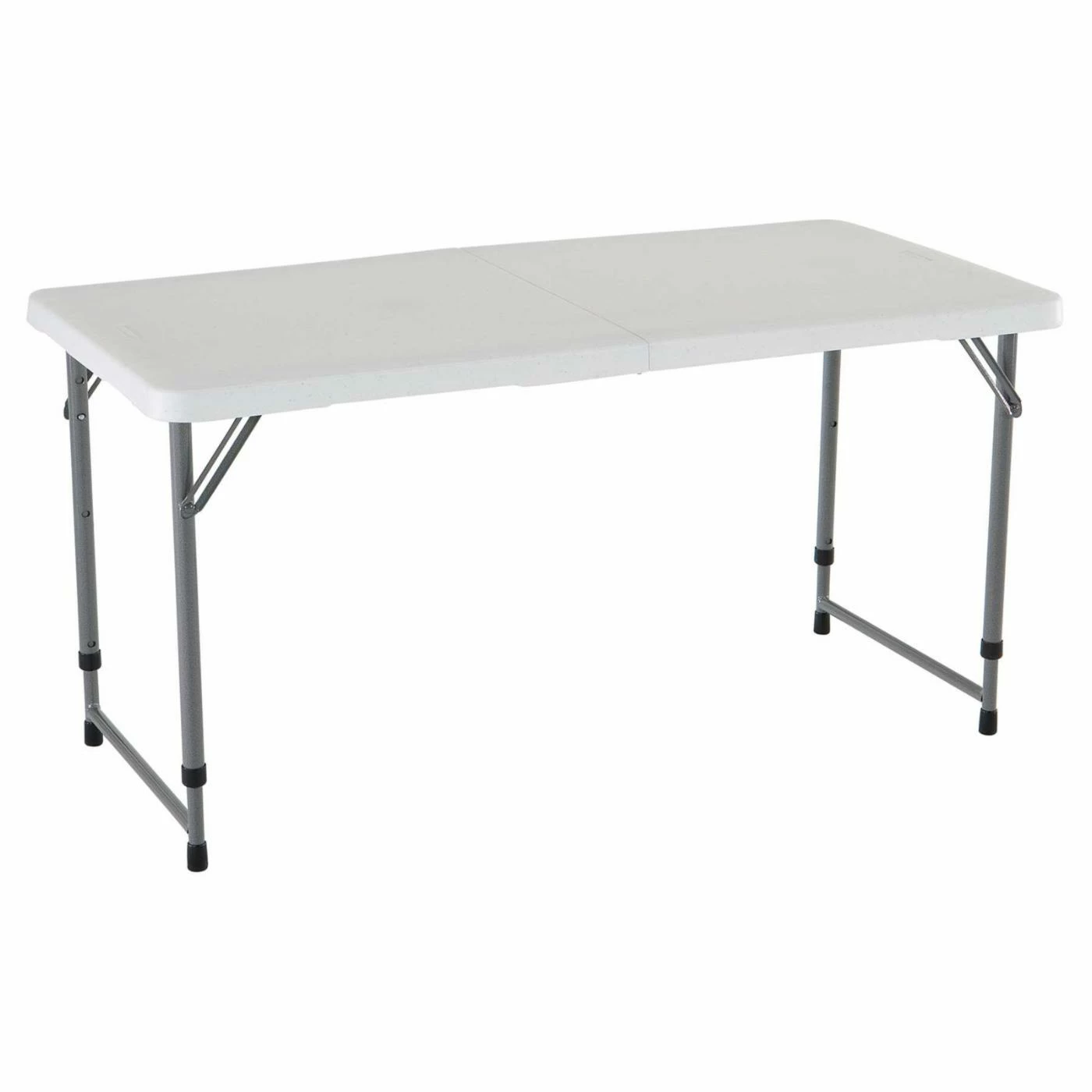 The white granite Lifetime Loop 4 ft. Light Commercial Fold-In-Half Adjustable Table is a great chair for home, office, and outdoor use. This table is highly versatile with three adjustable height settings and an easy-storage fold-in-half frame. Weather, stain, and UV resistant, this is one table that holds up absolutely anywhere. This table exceeds industry standards for weight capacity.