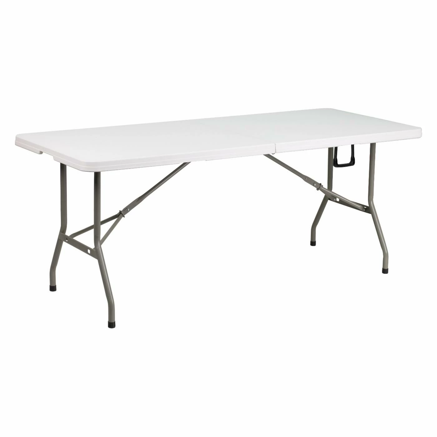 This Flash Furniture 72 in. Rectangle Bi-Fold Folding Table boasts a blow molded top and it’s made of plastic and metal for durable use. It boasts a bi-fold feature along with foldable legs and a carrying handle for convenient portability.