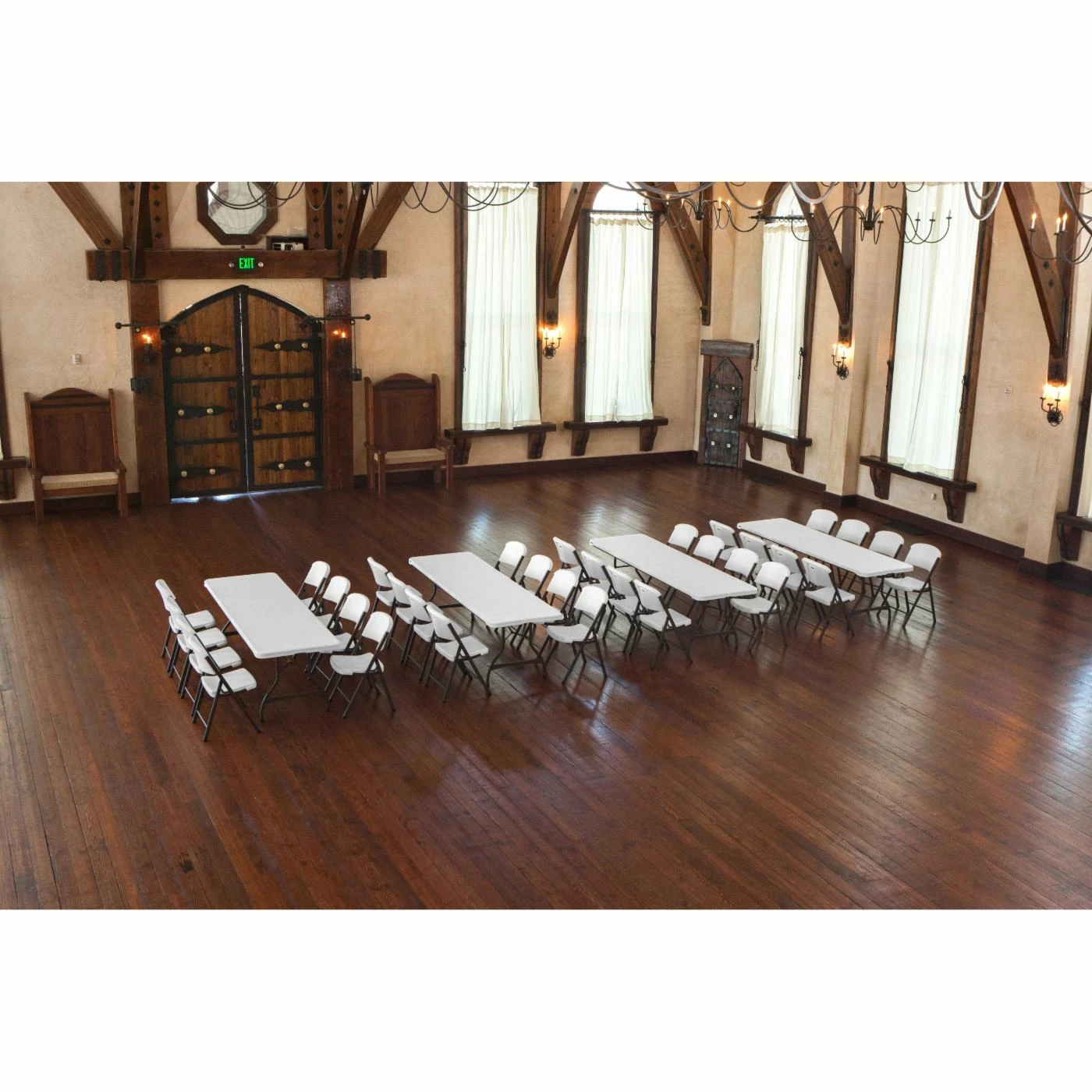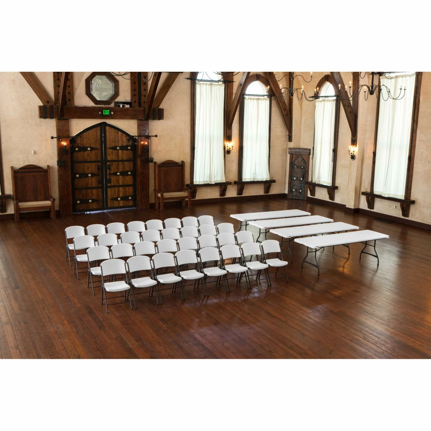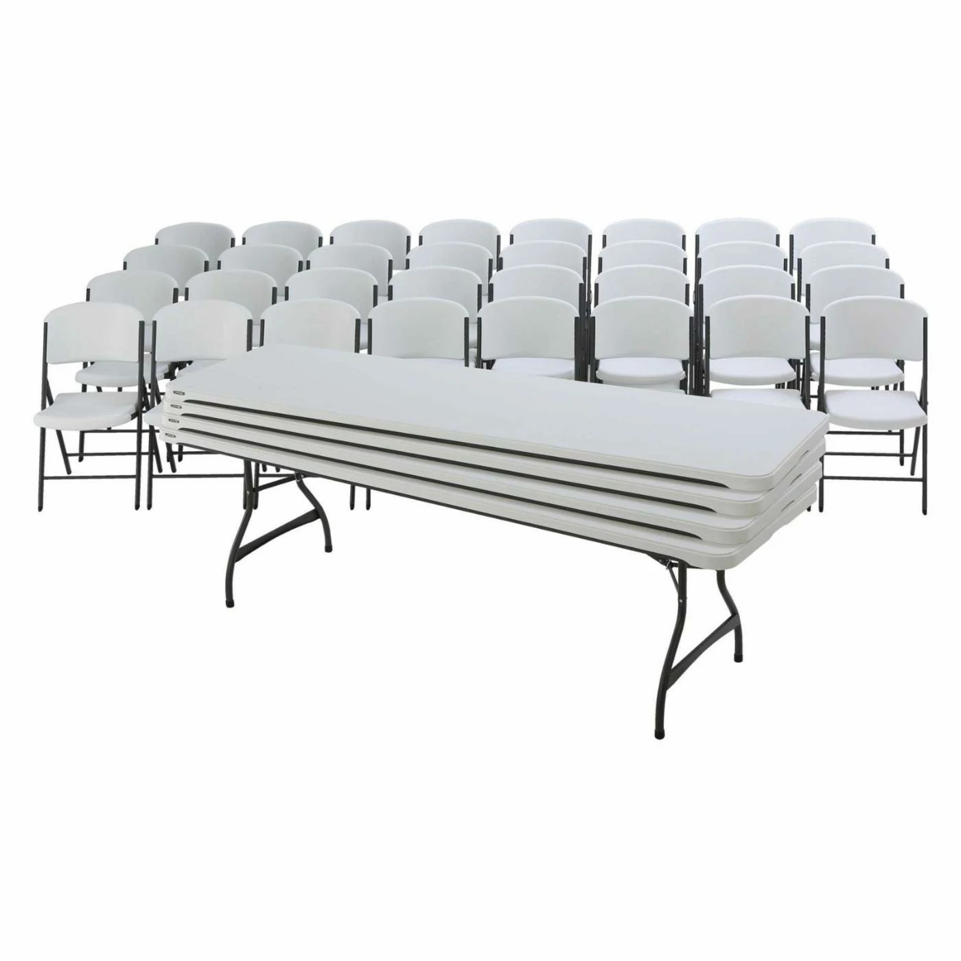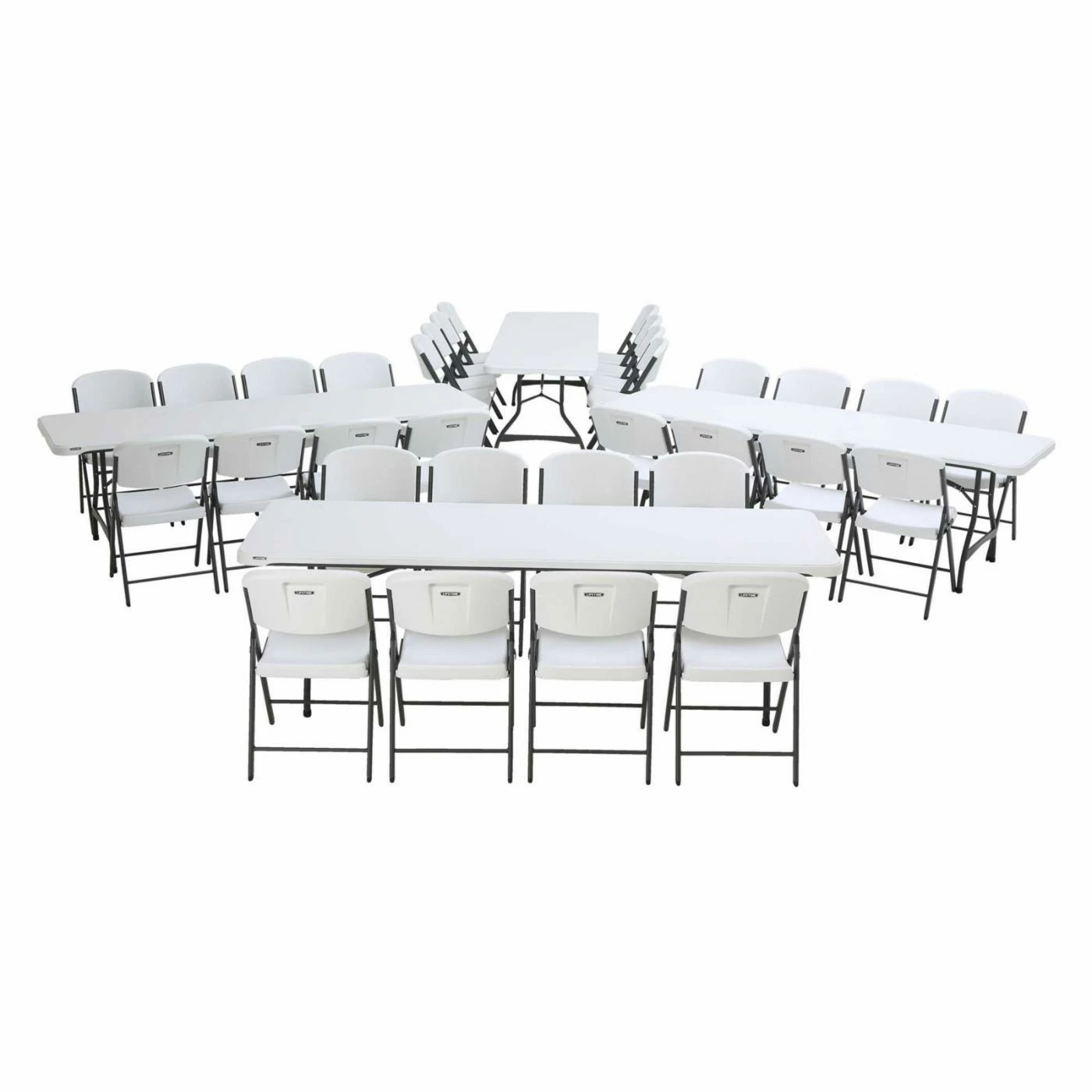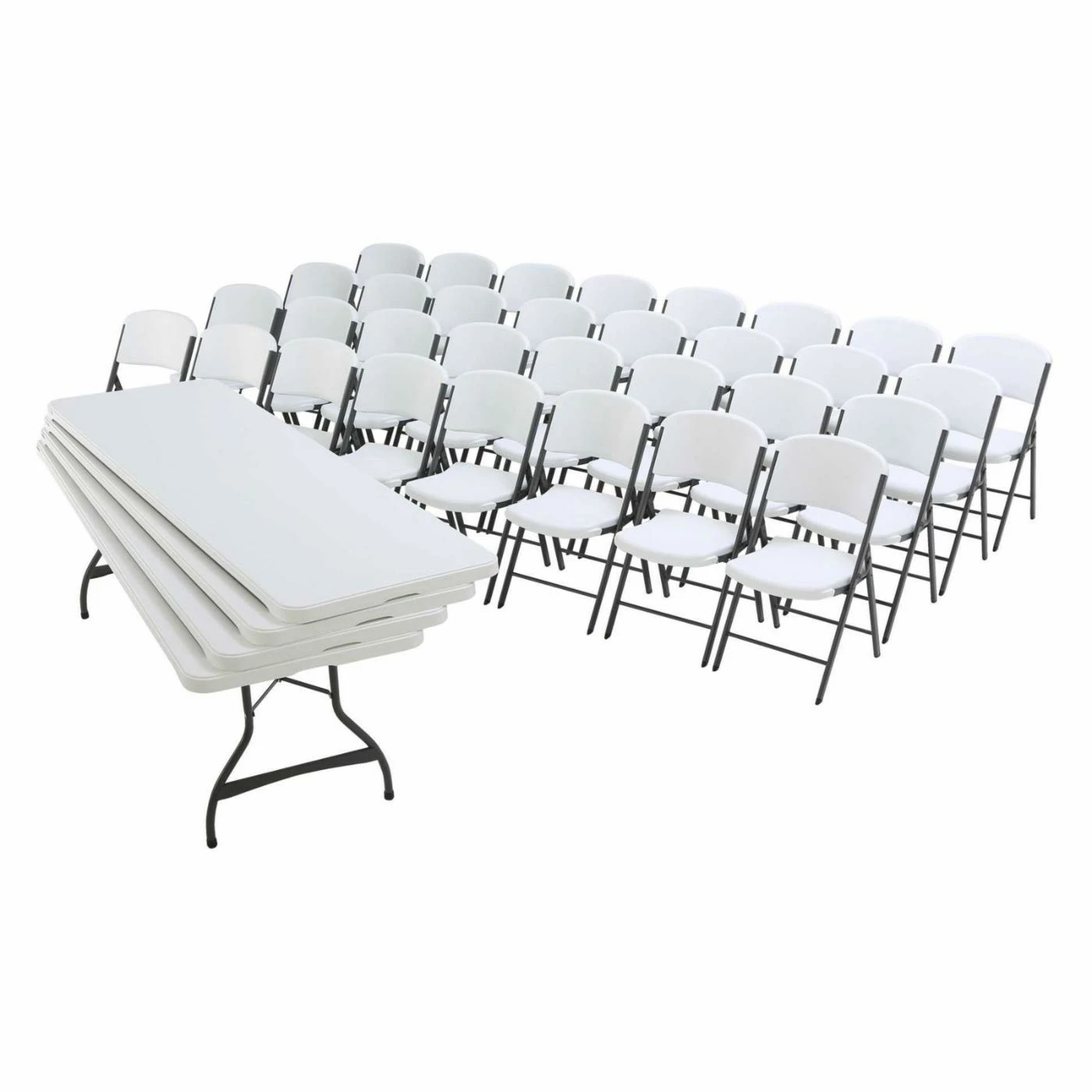 Be ready for any large-scale shindig in no time with the Lifetime 36 Piece 96 in. Stacking Tables and Chairs Set. This set includes four stackable tables and 32 folding chairs, making storage a cinch. Made with low alloy steel frames and polyethylene tabletops, everything in this set is easy to clean and built to last.