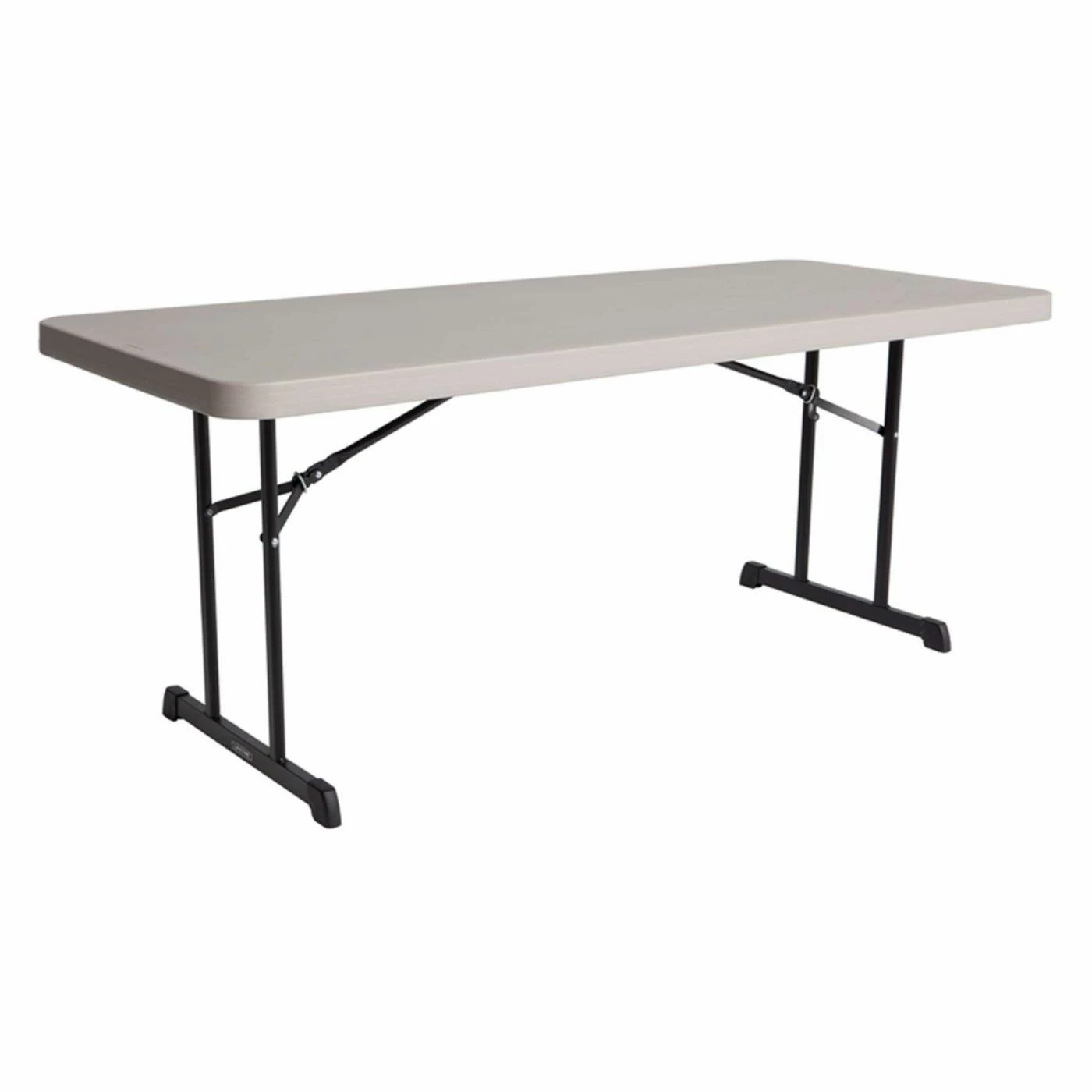 The Lifetime 6 ft. Rectangle Folding Table is designed for indoor or outdoor use in a residential or commercial setting. It is constructed with a high-density polyethylene top and a steel frame with a powder-coated beige finish. The rust- and stain-resistant table is weather-resistant, UV-protected, and will not chip, crack, or peel. This table seats six comfortably and is perfect for indoor or outdoor use. This folding table meets the ANSI and BFMA standards.