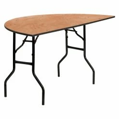 Featuring a space-saving design, this Flash Furniture YT-WHRFT60 60 in. Half-Round Wood Folding Banquet Table is perfect for your next event. This banquet table has legs that fold under for convenient storage. This commercial-grade banquet table is made of durable wood and metal.